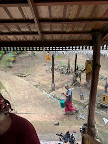 "River Kwai Jungle Rafts" a floating hotel was wonderful but very primitive!! Our traveling friend Stacy recommended this hotel to us, man was it fun! You can't get by road; you must meet a boat and then ride 20 minutes to the floating hotel. Many rafts were connected together with rope and then tied to a tree on the bank, so we moved in and out from the bank with the current. No electricity we used lanterns, no air conditioner. The shower was just a hose on the back deck!!! We had mosquito netting over the bed. There was a village up a hill (of course there is a hill). That was very cool, their temple and gathering place had power but not their homes, there was a well in the center of the village. They had outhouses and they cooked outside. The elephants were cool when they came out to visit. We go to Chiang Mai next and then elephants Sanctuary.